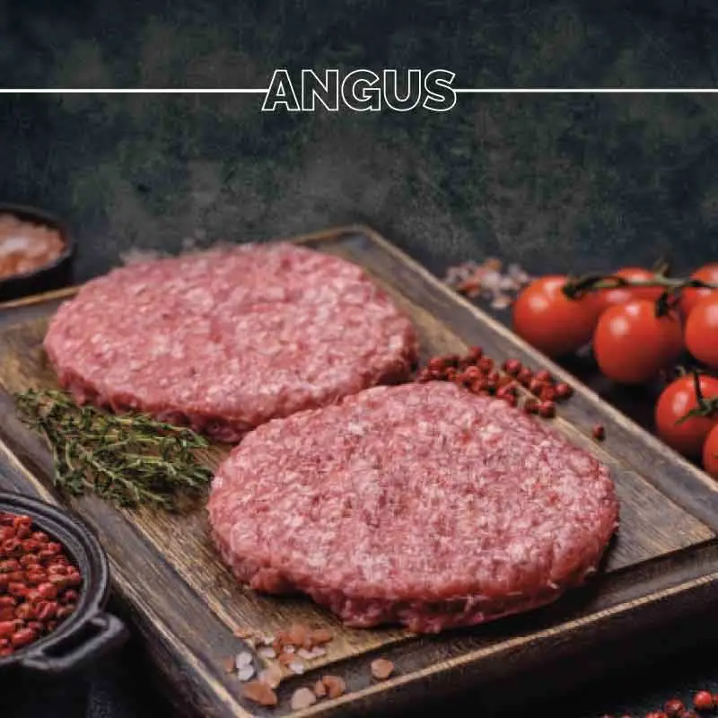 Nuestra burger meat de Angus, está elaborada al 100% con carnes procedentes de la raza “BLACK ANGUS”, dichas carnes están certificadas con autenticidad mediante una trazabilidad garantizada, la cual nos es proporcionada por nuestros especialistas criadores de esta raza. La carne de esta raza le da a nuestra burger meat unos valores organolépticos excepcionales debido a su alto marmoleo, éste le proporciona un sabor distintivo de textura suave y jugosa, así como un sabor rico y placentero al paladar.