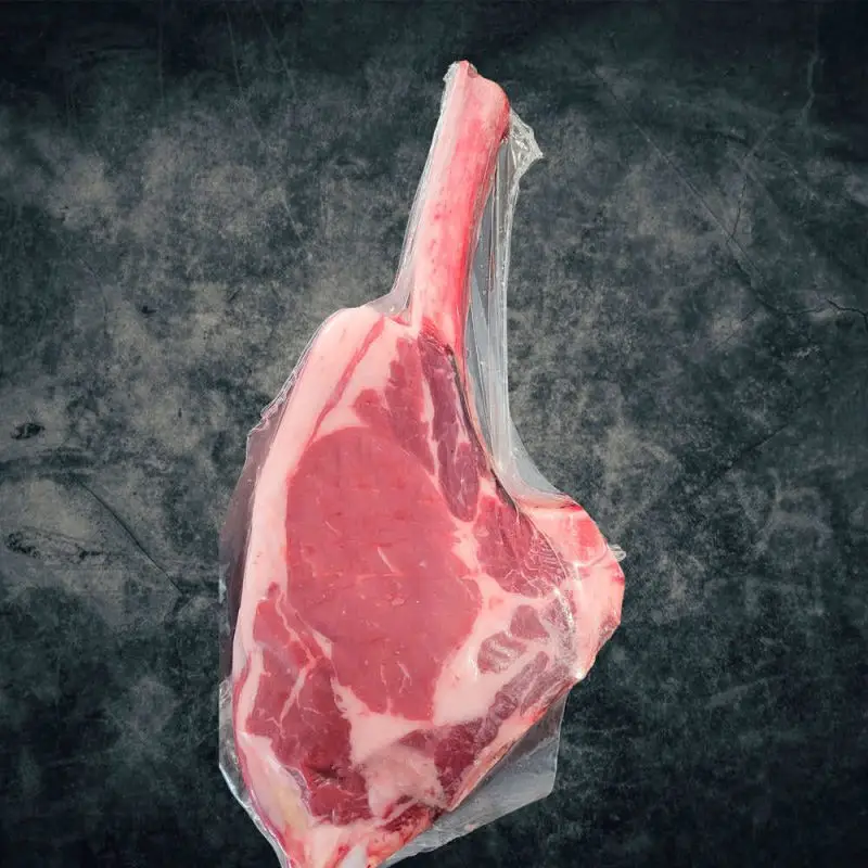 El corte Tomahawk se caracteriza por presentar el llamado Rib-eye unido al hueso, dejando este último más largo de lo habitual y exento de carnes. Nuestro Tomahawk lo procesamos a partir de las costillas del chuletón, dejando el hueso más largo de la costilla, lo que facilita el manipulado al cocinarlo e incrementa su sabor al llevar el hueso adherido, a la vez que enriquece la presentación en el plato. Se considera ante todo un corte premium, el cuál va destinado en su exclusiva al cocinado a la parrilla – barbacoa por su dimensiones.